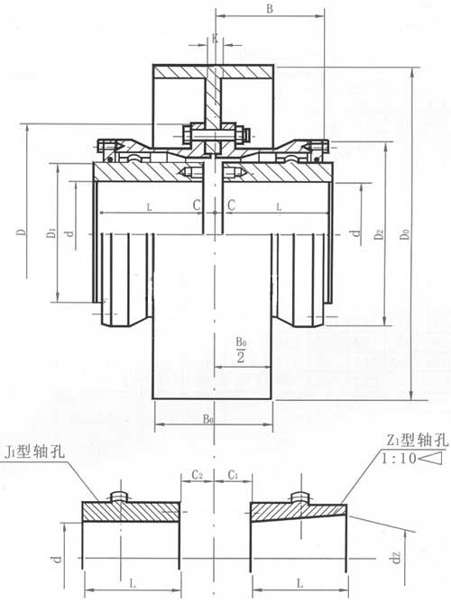 注:1、質(zhì)量與轉(zhuǎn)動(dòng)慣量是按 大直徑的Y軸孔計(jì)算的近似值,未計(jì)算制動(dòng)輪。 2、錐型軸孔 大軸徑至220mm。 3、不同制動(dòng)輪直徑的C、C1、C2植為表中數(shù)值再加K/2,k值見(jiàn)表4.11 |