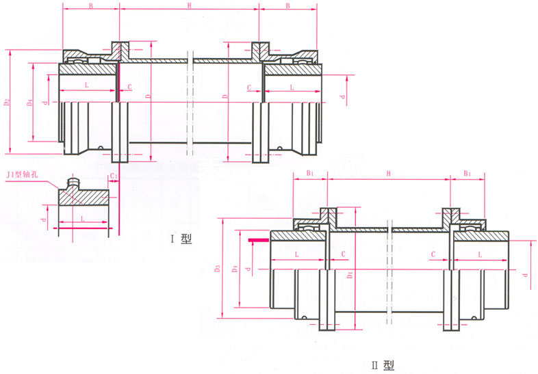 WGT型鼓形齒式聯(lián)軸器屬于剛撓性聯(lián)軸器,齒 式聯(lián)軸器是由齒數(shù)相同的內(nèi)齒圈和帶外齒的凸緣半聯(lián)軸器等零件組成。外齒分為直齒和鼓形齒兩種齒形,所謂鼓形齒即為將外齒制成球面,球面中心在齒輪軸線上, 齒側(cè)間隙較一般齒輪大,鼓形齒聯(lián)軸器可允許較大的角位移(相對于直齒聯(lián)軸器),可齒的接觸條件,提高傳遞轉(zhuǎn)矩的能力,延長使用壽命。有角位移時沿齒寬 的接觸狀態(tài)。具有徑向、軸向和角向等軸線偏差補償能力,具有結(jié)構(gòu)緊湊、回轉(zhuǎn)半徑小、承載能力大、傳動、噪聲低及維修周期長等優(yōu)點,特別適用于低速重 載工況,如冶金、礦山、起重運輸?shù)刃袠I(yè)、也適用于石油、化工、通用機械等各類機械的軸系傳動。